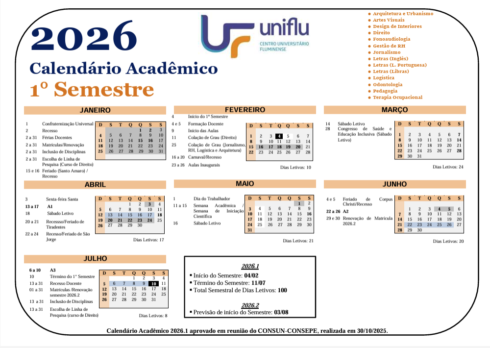 Calendário 2026/1º Semestre