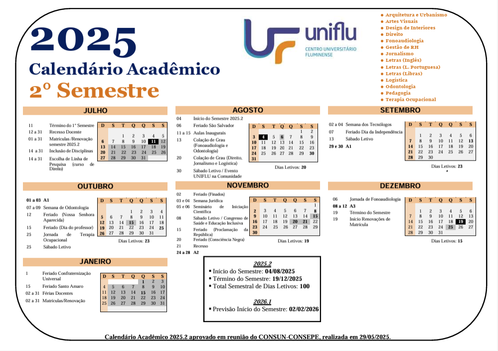 Calendário 2025/2º Semestre
