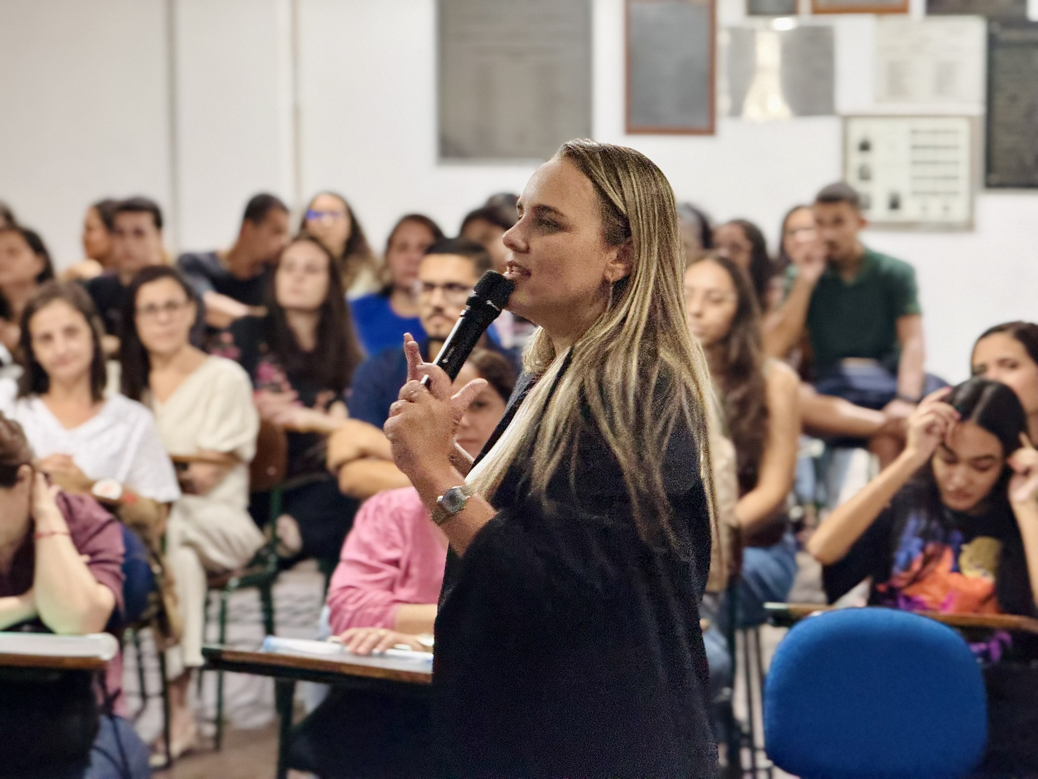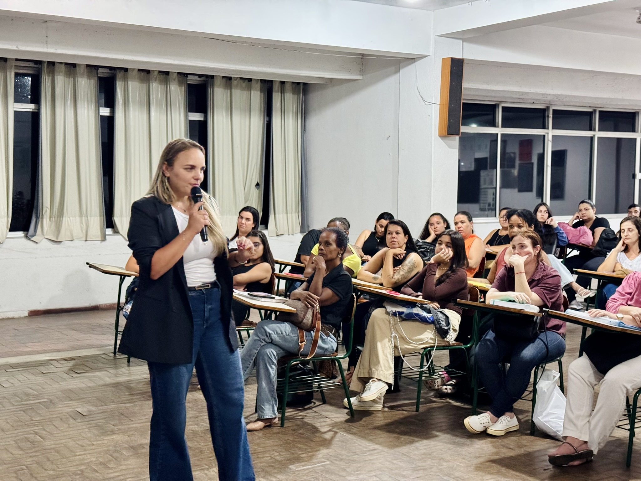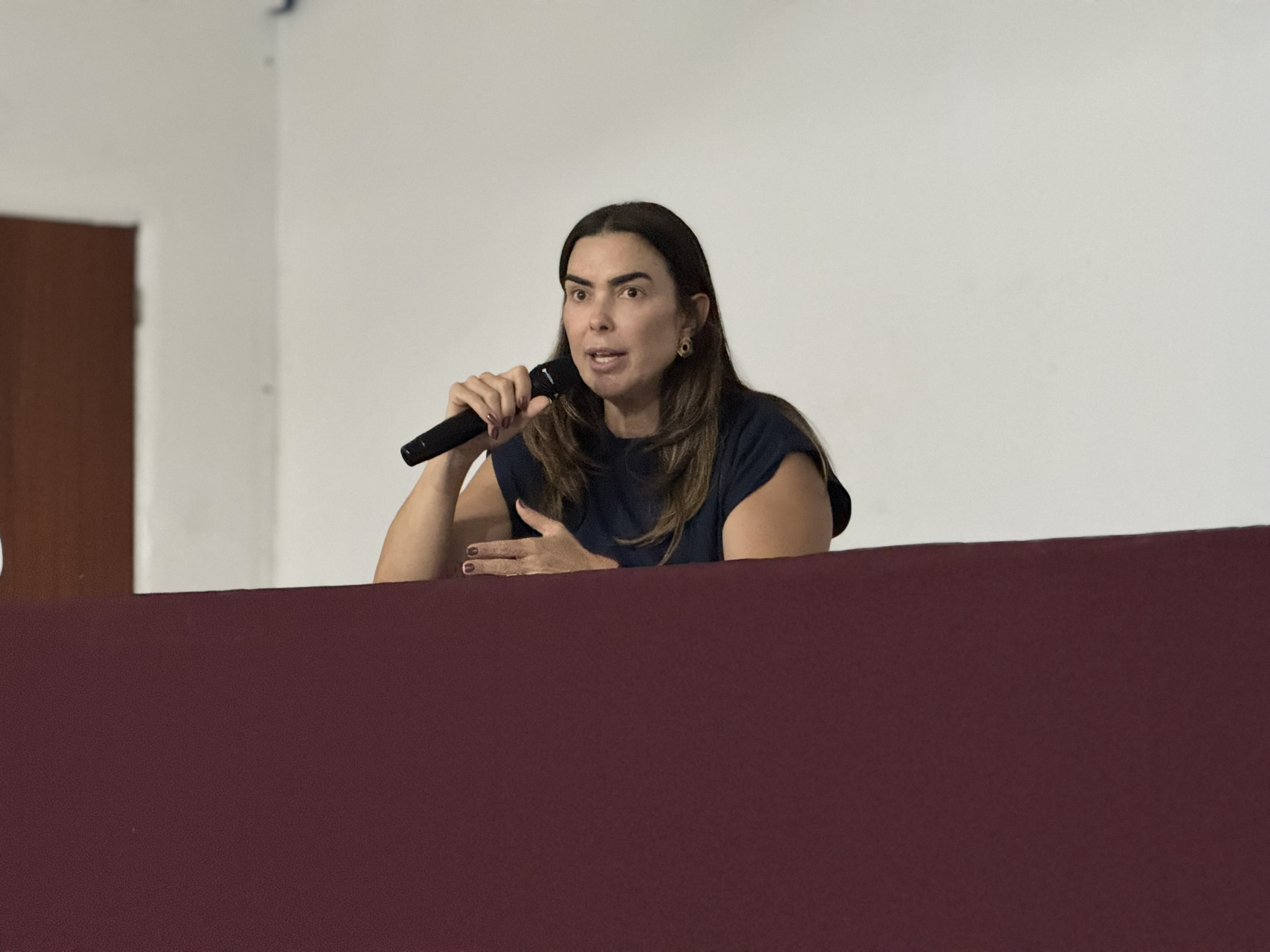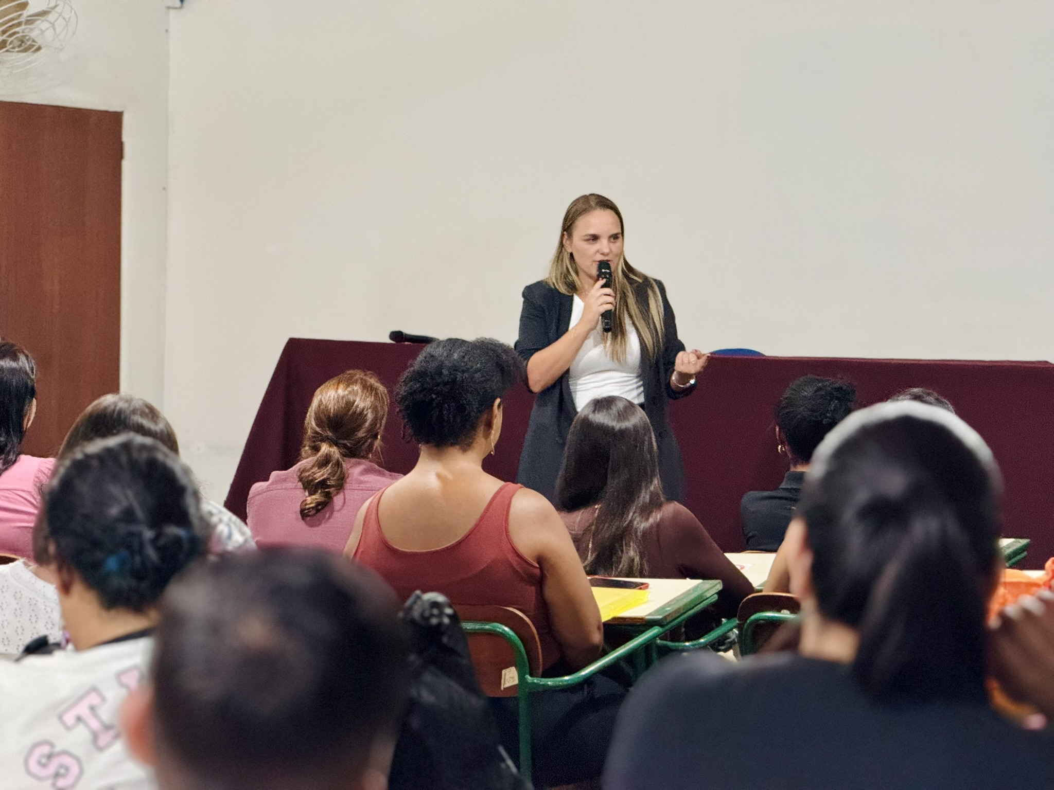 Durante o encontro, a convidada destacou a importância do autoconhecimento, da postura profissional e do desenvolvimento de competências essenciais para o mercado de trabalho, incentivando os alunos a assumirem protagonismo em suas trajetórias.